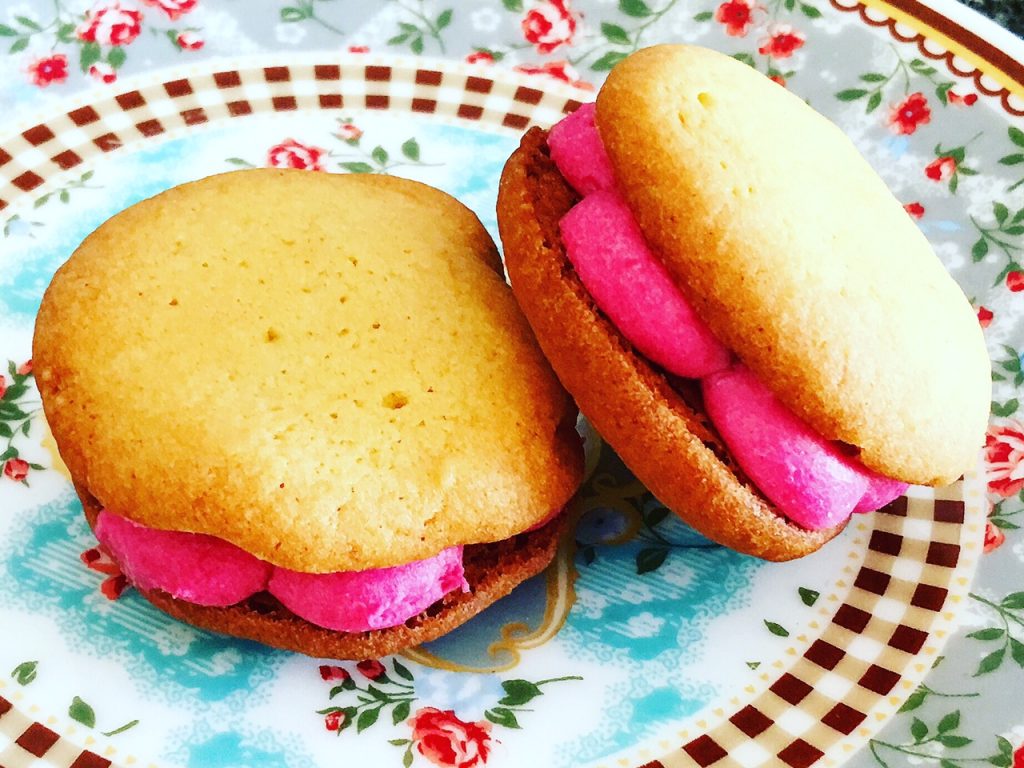 Dann einfach nur mit einem Spritzbeutel auf das Gebäck geben, für die Whoopies je auf einen geben und einen zweiten sanft draufdrücken, sodass man die Tupfen noch sieht!