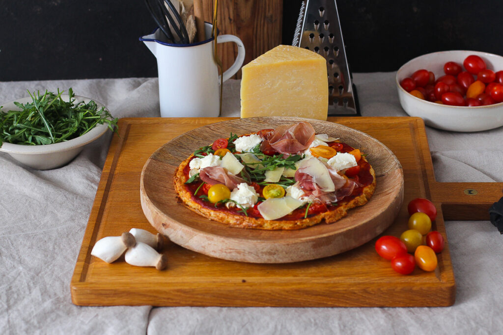 Schmeckt sowas überhaupt? Ja aber sowas von! Wenn selbst mein Mann mir fast alles wegisst, dann ist es gut und weit entfernt von einem „gesunden“ Geschmack, falls du weisst, was ich meine. Wir haben vielleicht alle das Quietschen von Magerquark zwischen den Zähnen im Sinn – davon sind wir hier aber weit entfernt! Der Mix aus körnigen Frischkäse von Bayernland zusammen mit Eiern und fein geriebenem Bayernland Rigatello – charakterlich wie ein typisch italienischer Hartkäse, den du sogar ohne Qualitätsverlust einfrieren kannst – ergibt einen Pizzaboden, der am Rand herrlich knusprig ist und innen saftig und zart. Und das Beste? Er macht richtig satt, ich war nach der halben Pizza happy.