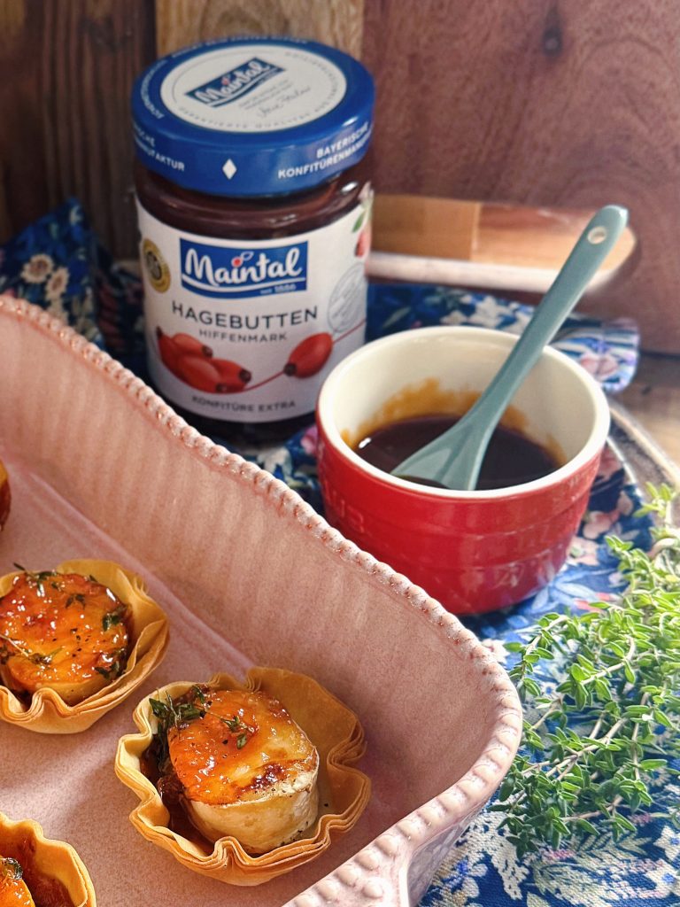 • Die Maintal Hagebutten-Konfitüre extra erwärmen und je einen Teelöffel auf den Käse geben.