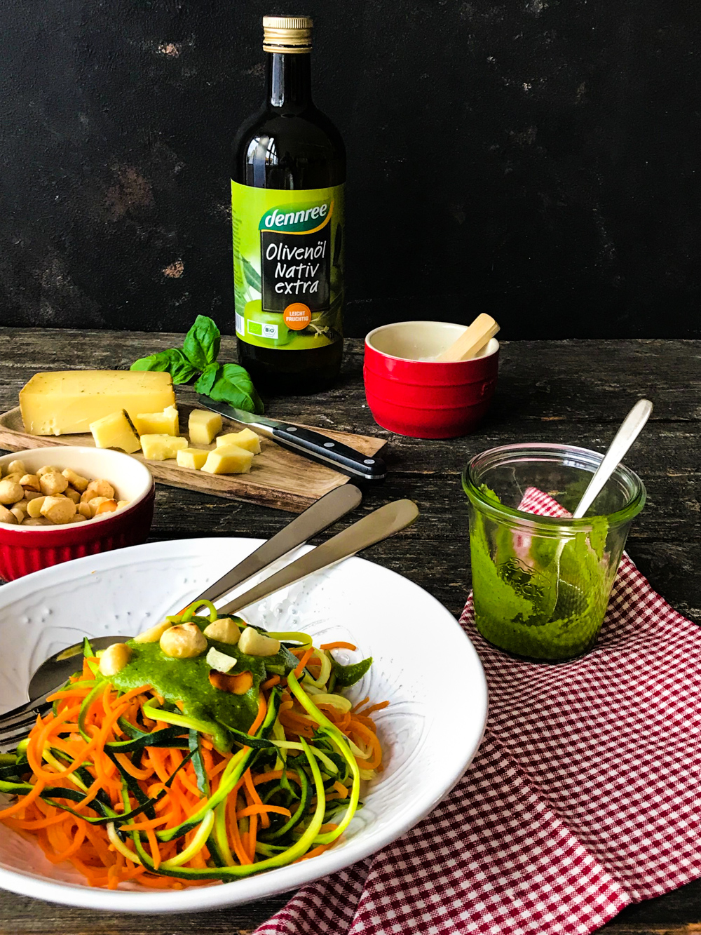 Das klassische Pesto mit Pinienkernen & Parmesan kennst du ja sicher. Aber warum nicht mal was Neues ausprobieren? Ich habe mich bei denn’s Biomarkt und BioMarkt umgeschaut und leckere Bio-Käse-Sorten der Käserei Wohlfahrt für dich getestet: mein Favorit ist der Oberpfälzer Wildkräuter Käse – ich habe ja schließlich einen Oberpfälzer geheiratet – und für alle, die es gerne würziger mögen oder Kuhmilch nicht gut vertragen der Zieg-Corino! Für eine feine nussige Note sorgen Macadamias, die vorher in der Pfanne geröstet wurden. Vermengt mit den frischen Tagliatelle, die du nur noch kurz kochen musst, schmeckt das ganz himmlisch, probiere es unbedingt aus!